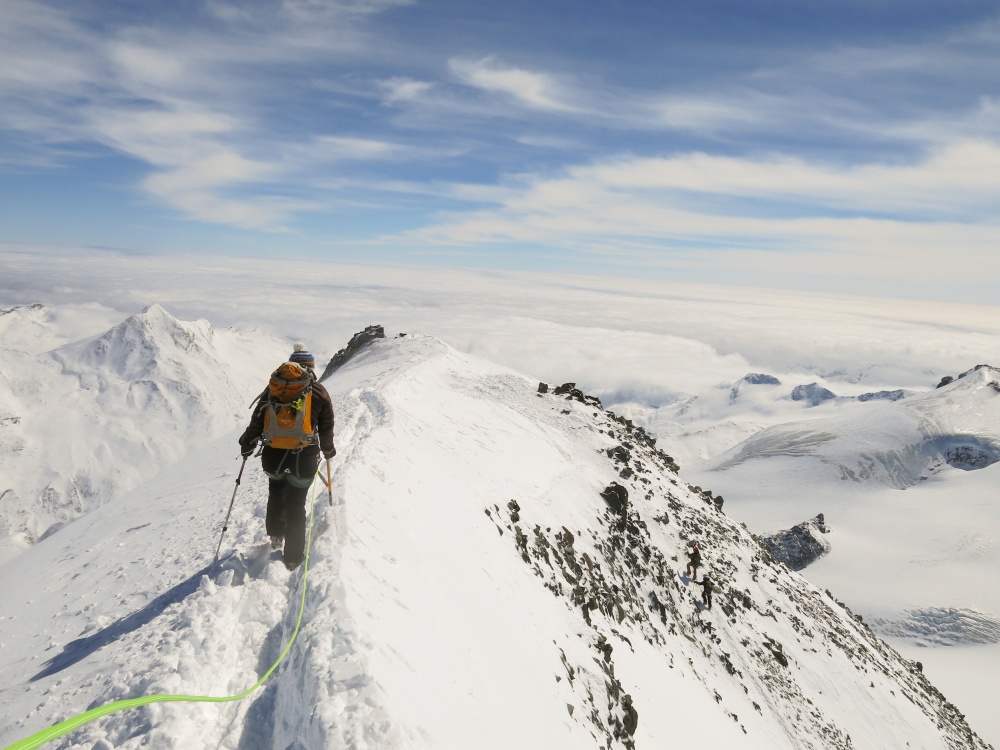 Nous repartons, Guillaume fait le pas du guide à merveille, nous dépassons quelques personnes qui commencent à sentir l’altitude. Le sommet n’est pas très loin mais j’ai une méchante débattue… La débattue, c’est vraiment toujours la même chose : dès qu’on la chope, on se dit que c’est fou d’avoir oublié si rapidement à quel point c’est douloureux. De très longues minutes passent pour que la douleur s’estompe et que je puisse à nouveau empoigner mon piolet magique. On repart, d’un bon pas, vers ce sommet. Oui c’est un sommet facile, oui il n’y a que 600m de dénivelés, mais je suis super heureuse d’y arriver, avec Guillaume comme guide. L’arrête sommitale et assez courte mais très jolie, le panorama est sublime, la croix se rapproche. Mon moment préféré.