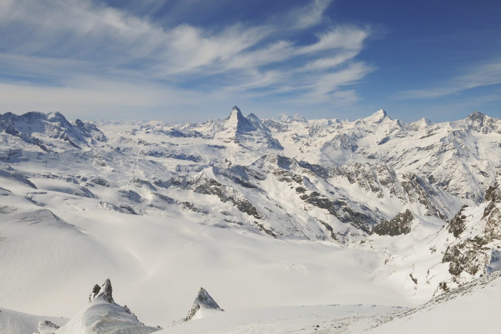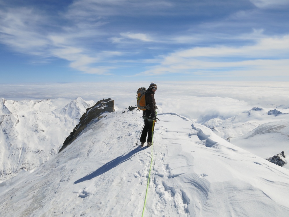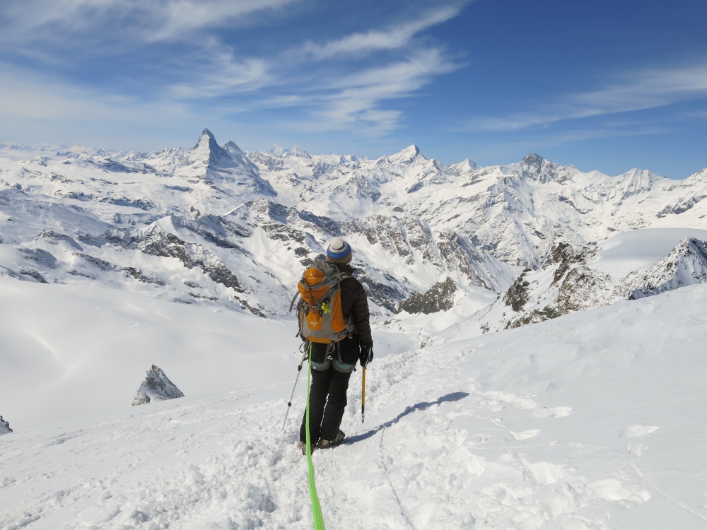 De là, la vue est juste sublime. Je ne m’attendais pas à un tel panorama. Aucune trace, un ciel bleu (la bise a ses avantages), le Cervin en face, qui nous fait un clin d’œil… Niveau souffle, tout va pour le mieux. 200m environ avant le sommet, nous nous arrêtons pour enlever les skis et mettre nos crampons. Il y a quelques jolies plaques de glace et nous préférons être prudents. Bien sûr, j’avais mal réglé mes crampons et je galère à les ajuster à mes chaussures… et surtout, je gèle ! Le vent souffle à nouveau très fort et malgré mes sous-gants j’ai vraiment froid aux mains.