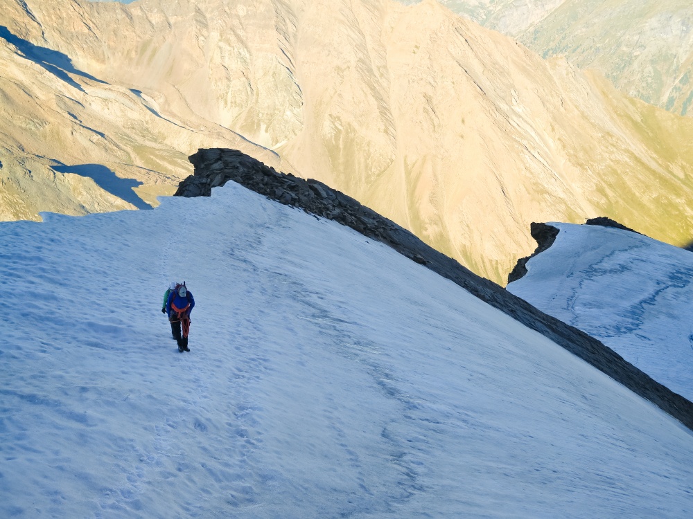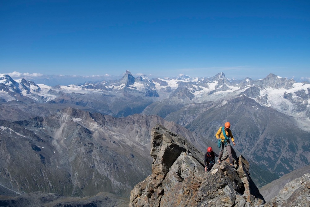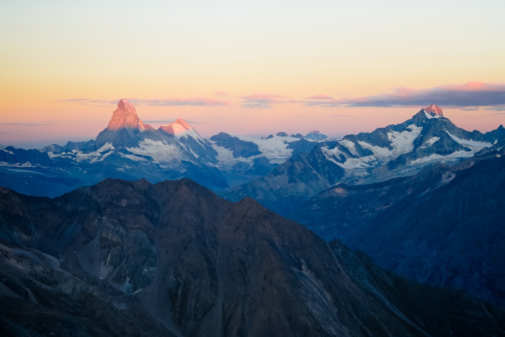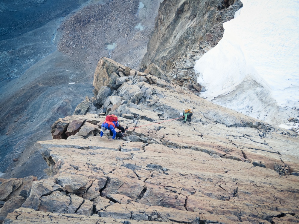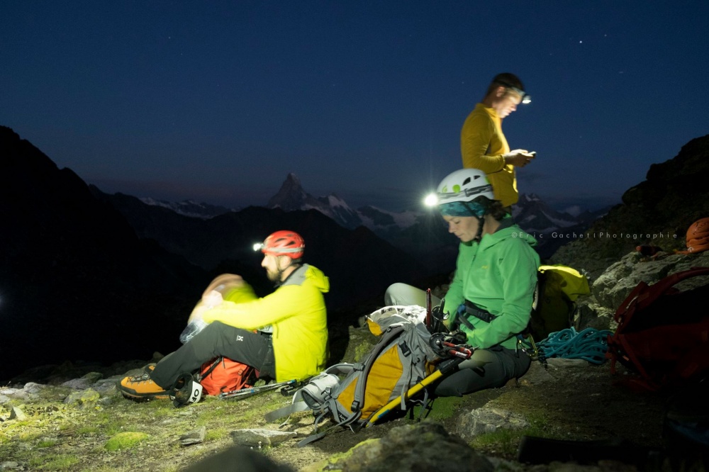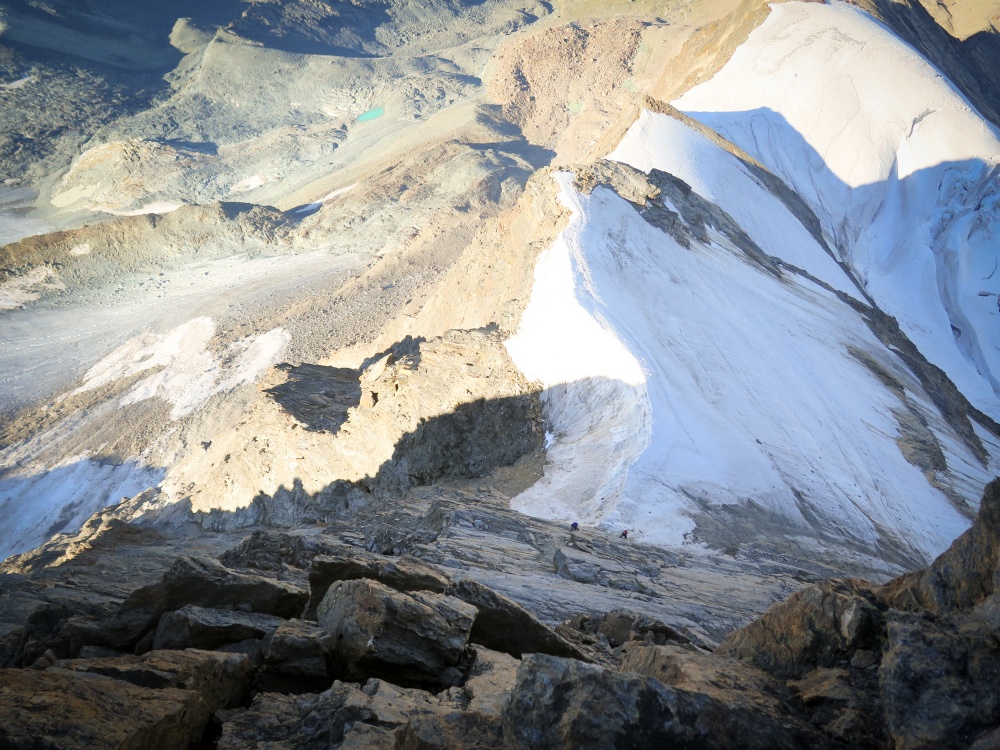 C’est pour moi toujours la récompense, ces moments-là. Ça vaut tous les réveils en pleine nuit, les marches d’approche, les rôtis rassis. Le Weisshorn se dévoile, plus majestueux que jamais. Les couleurs sont grandioses, pourpres, violettes, l’ambiance est surréelle. On a envie de faire une pause à chaque mètre pour se retourner, admirer le paysage et prendre une photo. Le Weisshorn, le Cervin, le Täshorn, tous les 4’000 se dévoilent et ce n’est pas fini !