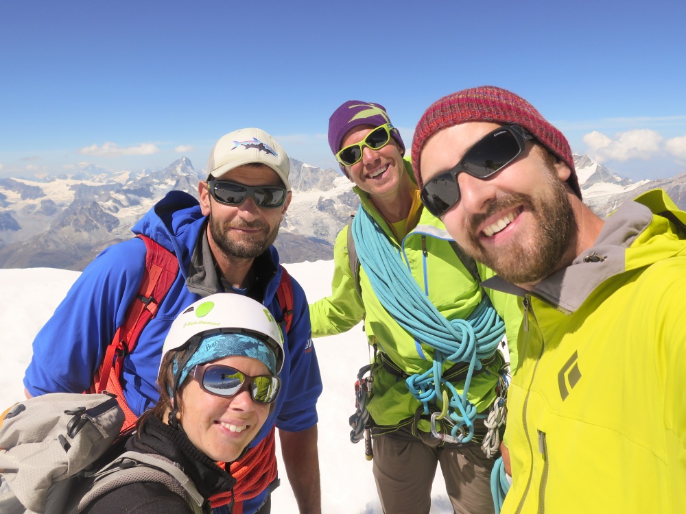 Jérôme, Guillaume et Eric arrivent à la fin des difficultés. C’est presque indécent le nombre de 4000 qui nous entourent… la courone impériale bien sûr avec le Cervin, la Dent Blanche, le Weisshorn, le Zinalrothorn et l’Obergabelhorn, le massif du Mont-Rose, le Lyskam, les Breithorns, le Stralhorn de cet hiver, on les voit tous… tant de souvenirs, de sommets gravis, de montagnes comtemplées.