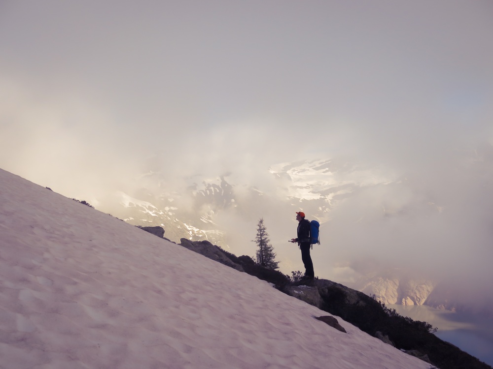 Niveau glamour, je ne suis pas au top donc. Mais j’avance, lentement et sûrement… c’est l’essentiel ! Je me réjouis d’être au pied de l’arête et de pouvoir faire autre chose que de poser un pied devant l’autre. On gagne de l’altitude, puisque désormais il nous faut marcher sur la neige. Les crampons restent dans le sac, ça passe très bien sans. On arrive devant une première petite longueur, on s’encorde et Eric part en tête. J’essaie de le suivre, mais je galère ; je n’ai plus grimpé depuis un moment et le rocher est détrempé… aïe aïe aïe, j’espère que ça ne sera pas tout le temps comme ça. Eric nous rassure et nous dit que pour la suite, le rocher doit être sec. Les choses sérieuses commencent, et on attaque cette arête. Il y a plusieurs sommets et elle n’a pas l’air toute courte, mais le panorama est déjà sublime ! On aperçoit le barrage en-bas, et on se rend compte du chemin parcouru !