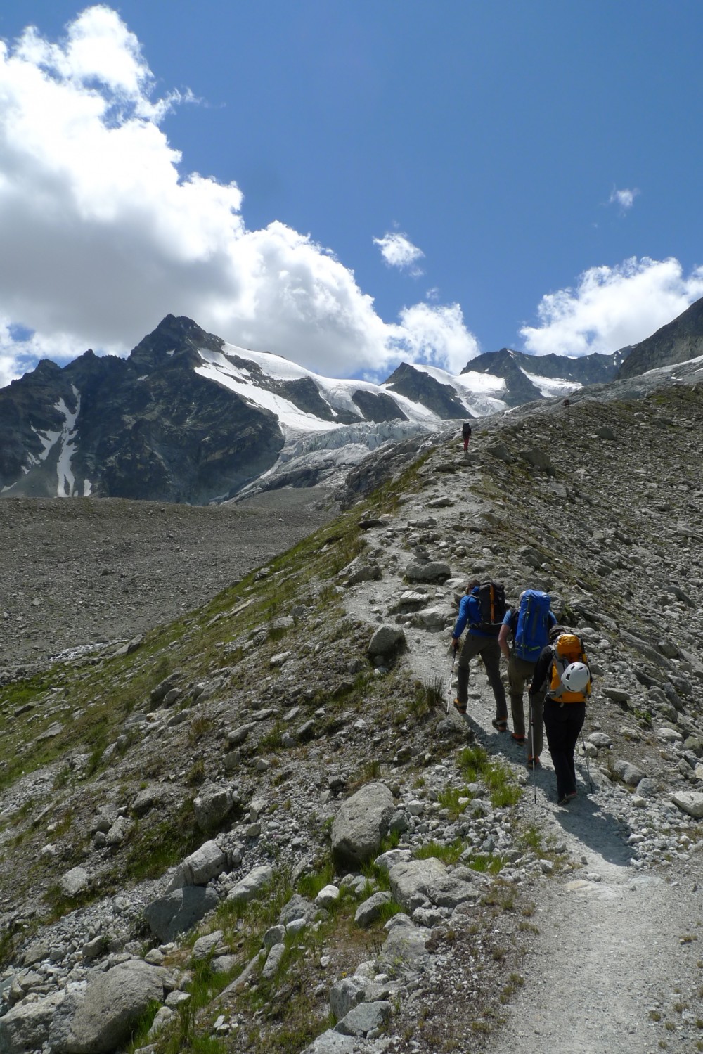 En route donc pour Zermatt. Heureuse de retrouver les 2 guides, flippée bien sûr de savoir ce qui m’attend. La montée à la cabane, avec ses 1600mètres de dénivelés, se passe bien, les paysages sont beaux. Petit à petit la végétation se fait rare, la moraine ressemble à un paysage lunaire. Arrivés à la cabane de la Rothornhütte vers 17h.